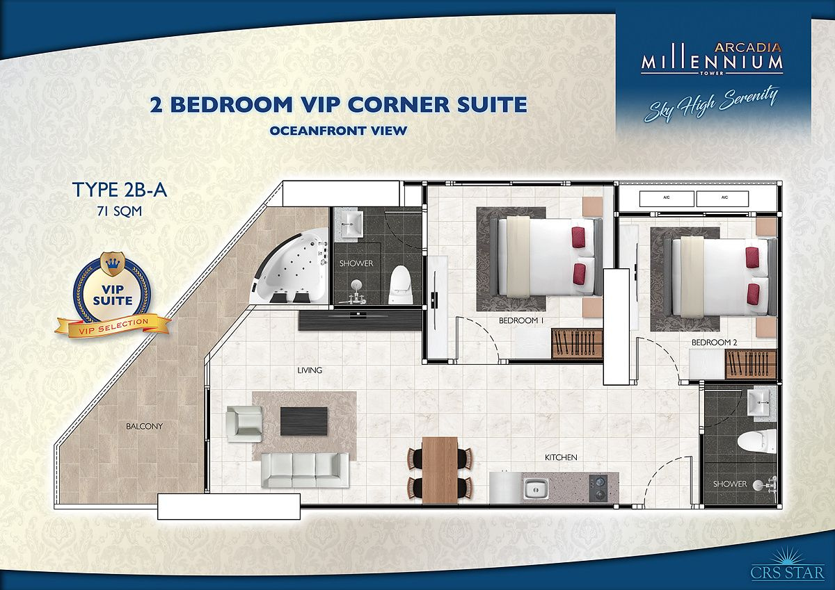These unparalleled views can be appreciated fully from the enormous 31st floor infinity pool, as well as from the rooftop infinity pool with daunting, state-of-the-art overhanging pool sections pulling you out into the abyss. Additional, first-class development amenities include a spectacular hotel-style lobby ascending 12 meters high, sky-high fitness club & Zen Yoga relaxation zones, lush botanical gardens with open-air barbeque areas, an array of sports & leisure amenities, health spa & sauna, and commercial area with gourmet restaurant and much more. At the Pinnacle of LuxuryArcadia Millennium Tower features a diverse range of luxurious residential suites with something to cater for every prospective buyer.
