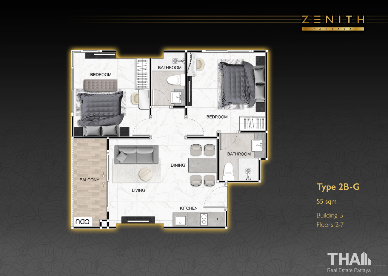 We are pleased to offer this exceptional two-bedroom apartment, Unit 2B-G, situated on the 5th floor of the prestigious ZENITH Pattaya development. With a generous 55 sqm of living space arranged in a practical and elegant square floor plan, this fully furnished apartment stands out for its intelligent use of space and bright, airy atmosphere enhanced by high ceilings and large windows. The apartment features 2 bedroom, 2 bathroom, and a spacious private balcony offering unobstructed, elevated views over the lush tropical garden and the resort's stunning swimming pools — a serene backdrop that transforms everyday living into a true resort-style experience.